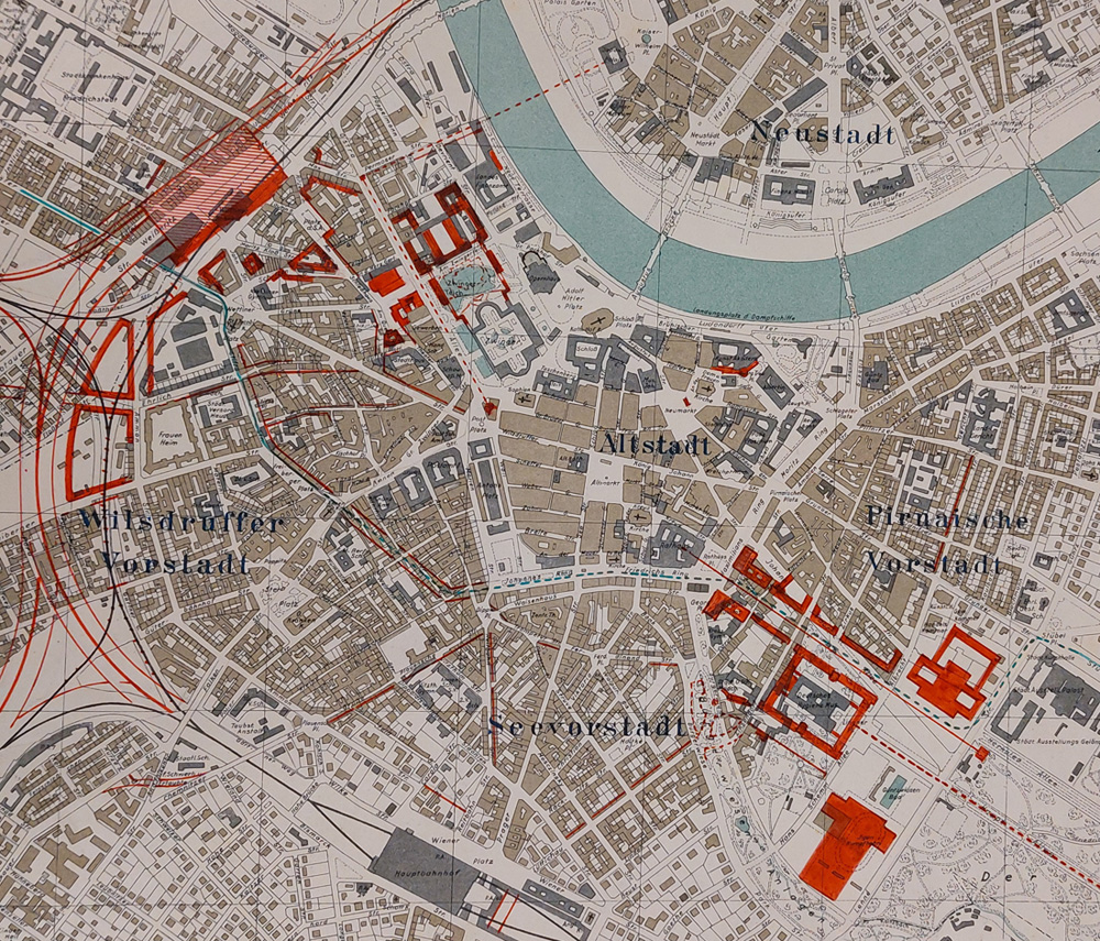 Fünfte Stufe: Mai 1940 Das Dresdner Stadtplanungsamt unter Paul Wolf fertigte im Mai 1940 einen weiteren fünften Plan zur Neugestaltung der Innenstadt Dresden an: ![]() Plan: „Neugestaltung der Innenstadt Dresden“, 23.05.1940 vom Stadtplanungs- und Hochbauamt Dresden. Nicht von Paul Wolf unterzeichnet, aber, da der Plan von seiner Behörde kam, wohl von ihm initiiert. Vergrößerung Foto: Stadtarchiv Dresden, 6.4.40.1 Stadtplanungsamt Bildstelle, Nr. II7864, Fotograf/in unbekannt, 1939. (schwarz: geplante Neubauten, schräge Schraffur: vorhandene Gebäude) Ein Grund könnte der neue Oberbürgermeister der Stadt Dresden, Dr. Hans Nieland, gewesen sein. Der Hamburger Senator und NSDAP-Mitglied Nieland war nach drei Jahren interimistischer Besetzung mit Rudolf Kluge am 08. Januar 1940 zum neuen Dresdner Oberbürgermeister ernannt und von Martin Mutschmann am 5.März 1940 in sein neues Amt eingewiesen worden. Er war Oberbürgermeister bis 19.Februar 1945. Nähere Infos zu Nieland: https://saebi.isgv.de/biografie/Hans_Nieland_(1900-1976) Tatsächlich wurde dieser Plan „Neugestaltung Innenstadt“ Dresden vom Mai 1940 nirgends publiziert. Möglicherweise war er im ersten Kriegsjahr nur für den internen Gebrauch innerhalb des Dresdner Stadtplanungsamtes bestimmt. Änderungen Die große breite Ausfallstraße nach Südosten wurde eine Nummer kleiner. Der große Platz am Ende der Achse entfiel. Es gab keine konkretere Planung von Großbauten entlang dieser Achse, die nun einen anderen, mehr nach Süden verlagerten Verlauf nehmen sollte. In dieser Konzeption von 1940 wurde eine erneute Durchbruchstraße durch die Wilsdruffer Vorstadt an der Annenkirche geplant – wieder mit Tunnelunterführung an dieser neuen Kreuzung. Am Freiberger Platz vorbeiführend, dort an der durchgezogenen Freiberger Straße einen neuen Platz bildend, war die Trasse nun nach Westen bis zum äußeren Ring (heute 26er Ring) gelegt. Besonders auffällig ist das erneut fett markierte, also wieder priorisierte Quartier in quadratischer Form anstelle der Mittelstraße am Westkraftwerk mit Anbindung an das neue Museumsquartier. Die „Altstadtsanierung“, also Überformung mit neuen Räumen, schien Paul Wolf bis zum Schluss immer wieder zu beschäftigen. Es ist sehr verwunderlich, dass das Stadtplanungsamt über den Kopf des allmächtigen Mutschmann und seiner 1939 festgelegten vier Schwerpunkte erneut eigene Schwerpunkte setzte. Vom Wiener Platz sollte nun 1940 die Durchbruchstraße ohne gebogenen Schwung Richtung Postplatz verlaufen, sondern in gerader Linie. Die Markthalle, das Gebäude der Deutschen Bank (Johannes-Ring 10) und weitere Gebäude am Altstädter Ring sollten jetzt doch erhalten werden. Offenbar hatte es Kritik über die massiven Abrisspläne gegeben, war doch gerade die Markthalle für die Einwohner der Viertel ringsum unentbehrlich im täglichen Leben. Zudem wurde jetzt hier an dieser neuen Kreuzung ein Parkplatz eingeplant. ![]() Foto um 1935: Sammlung „altesdresden.de“. Sollte nun doch erhalten werden: Gebäude Antonplatz 1 am Ring. Das geplante Museumsviertel hinter der Semperoper wurde noch einmal vergrößert. Fast alle Speicheranlagen sollten nun, durch die komplette Aufgabe des ehemaligen innerstädtischen Hafengeländes, abgerissen werden. Der Dresdner Architekt und Künstler Paul Andrae entwickelte, von der staatlichen Hochbaudirektion beauftragt, neohistoristische Pläne für ein neues ausgedehntes Museumsquartier. Dieses hätte eine zentrale symmetrische Mittelachse durchzogen, die vom Theaterplatz bis zu einem monumentalen Gebäude am Ende der Achse gereicht hätte. Zur Elbe hin war dann eine Promenade als neue Terrasse geplant, die an die historische Altstadtsilhouette anschließen sollte und mit der die NS-Landesverwaltung im „Fremdenverkehr“ nach dem gewonnenen Krieg imponieren wollte. Die Pläne der sächs. Hochbaudirektion und vom Dresdner Stadtplanungsamt, neun Monate nach Kriegsbeginn mit den Überfällen auf Polen, Belgien, Niederlande, Luxemburg, Dänemark und am Beginn des Frankreichfeldzuges signalisieren: selbst im Weltkrieg hatte es offenbar noch eine Priorität, die Neugestaltung der Dresdner Innenstadt weiter zu modifizieren – für die Zeit nach dem „Endsieg“, von dem man sich nicht vorstellen möchte, wie Deutschland, Europa und die Welt dann ausgesehen hätten. In einer modifizierten Planung, die sich bis ins Jahr 1942 erstreckte, sollte die von Wilhelm Kreis bereits in der Ausführung begriffene Opernhaus-Erweiterung mit einem neuen Gebäudeflügel verdeckt und abgeriegelt werden zugunsten eines ausgedehnten Forumplatzes in einheitlicher Architektursprache mit Kolonaden, einem hohen Campanile, einem Torgebäude und einer durch Stufen abgesenkten, quadratischen Platzfläche. Auch dieser geplante „weihevolle“ Stadtplatz sollte einer propagandistischen Manipulation seitens der Machthaber dienen. Das fertiggestellte Modell wurde Ende 1942 fotografiert, als in der Schlacht um Stalingrad die deutsche Wehrmacht eine verheerende Niederlage erlitt und damit der Weltkrieg endlich eine andere Wendung nahm. ![]() Modell Neugestaltung der „Speicherterrassen“, Aufnahmedatum 08.11.1942, spätere Fassung mit Obelisk am Ende der Achse, Foto (Ausschnitt): Stadtplanungs- und Hochbauamt Dresden, Bildstelle. Vergrößerung Stadtarchiv Dresden, 6.4.40.1 Stadtplanungsamt Bildstelle, Nr. XIII3881, Fotograf/in unbekannt, 1942 Planung zur „Dresden Erschließung“ von Oberregierungsrat Heinrich Koch 1940 Das Stadtplanungs- und Hochbauamt Dresden unter Paul Wolf war im Jahr 1940 jedoch nicht die einzige Stelle, die sich um die Zukunft der Verkehrsführung in der Innenstadt von Dresden Gedanken machte. Der Dresdner Architekt und Oberregierungsbaurat Heinrich Koch (1873-1945), bekannt durch die Ausführung des Sächsischen Hauptstaatsarchives 1912 bis 1915 auf Neustädter Seite, fertigte im zweiten Kriegsjahr 1940 umfangreiche Pläne zur „Dresden Erschließung“ mit altem un