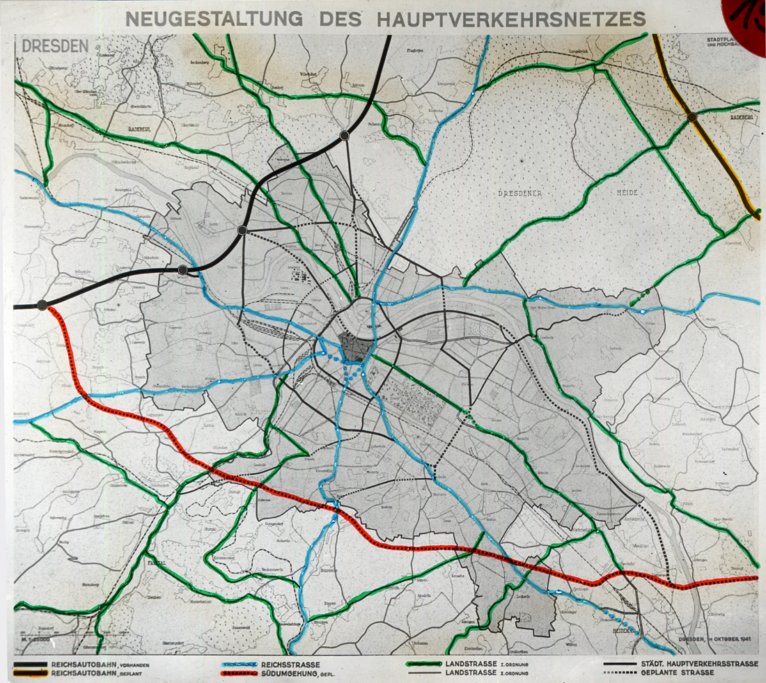 Verkehrsaspekte: Beginn des Umbaus zur autogerechten Stadt Paul Wolf war ein Städtebauer, als die Moderne am Anfang des 20. Jahrhunderts die europäischen Großstädte in ihren alten Stadtkernen mit massiven Veränderungen konfrontierte. 1928 unternahm er eine längere Reise in die neue Welt, wo er u.a. die jüngsten dynamischen Entwicklungen in New York, Washington, Chicago und Boston studierte. In New York z.B. seien bereits so viele Autos unterwegs, dass „die Straßen im Stadtinneren nicht mehr den Anforderungen eines aufs höchste gesteigerten Verkehrs genügen.“ (71) Wolf notierte die Autounfälle mit Todesfällen: 1924 waren es in der USA-Statistik: 19 000 Tote, täglich durchschnittlich im gesamten Land 52 Tote und ca. 1200 Verletzte. An diesen Zahlen war gut erkennbar, wohin der künftige Großstadtverkehr auch in Europa bald führen würde. Es bestand eine dringende Notwendigkeit, den motorisierten Verkehr der Innenstädte besser zu ordnen. Weiter schrieb er: „In New York sind 1,5 Millionen Autos vorhanden, auf 5 Einwohnern entfällt ein Auto. In Washington sind es 200 000 Autos auf 500 000 Einwohnern, dh. 2 ½ Menschen auf ein Auto.“ und weiter: „Überall wird auf die Anlage von Autoparkplätzen, auch in den Fabriken für die Autos der Arbeiter usw. Rücksicht genommen. Der Amerikaner benutzt sein Auto gewöhnlich nicht länger als 2 Jahre, dann verkauft er es für 25-50 $.“ Wolf bewunderte „Großgaragen mit zahlreichen Stockwerken“ und „Flachdachbauten, wo das Dach zum Parken benutzt wird“. Diese Reiseeindrücke aus den USA, ein Jahr vor Beginn der Großen Depression 1929, hatten durchaus Auswirkungen auf seine rigorosen Umgestaltungspläne für Dresden zehn Jahre später. Inzwischen waren die bereits in der Weimarer Republik entwickelten ersten Autobahnpläne in einigen Teilen als „Reichsautobahn“ umgesetzt, so auch die Strecke von Chemnitz nach Dresden und in weiterer Planung nach Schlesien. Reichsautobahnen und Zufahrtsstraßen in die Innenstadt In Paul Wolfs Neugestaltungsplan 1938 sollten die Verbindungen der Autobahn-Abfahrten zur Innenstadt neu- bzw. ausgebaut werden: „Die nach Dresden führenden und noch geplanten Reichsautobahnen gaben Veranlassung zu einer durchgreifenden Neuordnung des Hauptverkehrsstraßennetzes, von dem besonders die Zubringer zur Reichsautobahn in der Durchführung begriffen sind. Bei der (...) Elbbrücke der Reichsautobahn ist auch bereits Rücksicht auf die spätere Durchführung einer städtischen Schnellbahn genommen worden. Auf Altstädter Seite wurde vor allem mit dem weiteren Ausbau einer niveaukreuzungsfreien Verkehrsstraße längs der Elbe begonnen.“ (72) ![]() Planung Reichsautobahn, Stand: 1938 (vor dem Münchner Abkommen 30.09.1938), Unbekannter Fotograf, Foto: Deutsche Fotothek, Ausschnitt. T.Kantschew. Gesamtes Bild: http://www.deutschefotothek.de/documents/obj/70032226 Für die neue Reichsautobahn Chemnitz-Dresden wurden 1937-1939 konkret diese drei Zubringerstraßen aus dem Dresdner Stadtzentrum geschaffen bzw. ausgebaut: Meißner Landstraße nach Briesnitz auf Altstädter Seite, Lommatzscher Straße und Hansastraße, beide auf Neustädter Seite. Stadtplan 1940 mit den drei Autobahnausfahrten: Dresden Altstadt,Dresden Neustadt, Dresden Nord: https://www.deutschefotothek.de/documents/obj/70400044/df_dk_0000050 Im September 1939 war bereits eine Planung für zusätzliche Autobahnen in der zuständigen Direktion der Reichsautobahnen, Oberste Bauleitung Dresden (OBR) mit dessen Leiter Claußnitzer vorhanden. Fritz Todt war, als „Generalinspektor für das deutsche Straßenwesen“ mit der Festlegung der Linienführung und die Detailplanung beauftragt, also auch für Planungen ins „Sudetenland“ und darüber hinaus in das so genannte Protektorat „Mähren und Böhmen“. Eine neue Verbindung sollte 1939 nördlich von Dresden ein Autobahnkreuz bilden: von Berlin kommend, weiterführend um die Dresdner Heide, westlich oder östlich von Pirna die Elbe kreuzend, über den Erzgebirgskamm bis ins sogenannte „Sudetenland“ und dann nach Prag/Wien (73). Auch hier waren die Anschlüsse der geplanten Elbtal-Fernverkehrsstraße an die neue Autobahn einzuplanen. Auf Lokalebene spiegelten sich wie in einem Brennglas nach dem Münchner Abkommen bereits 1938/39 die Expansionspläne des Dritten Reiches, die bald darauf in den II. Weltkrieg mündeten.