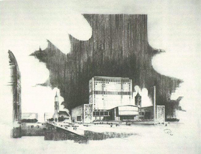 Richtfestes Altmarkt Westseite 19.12.1953 mit Zeichnungen von ihm. Foto: