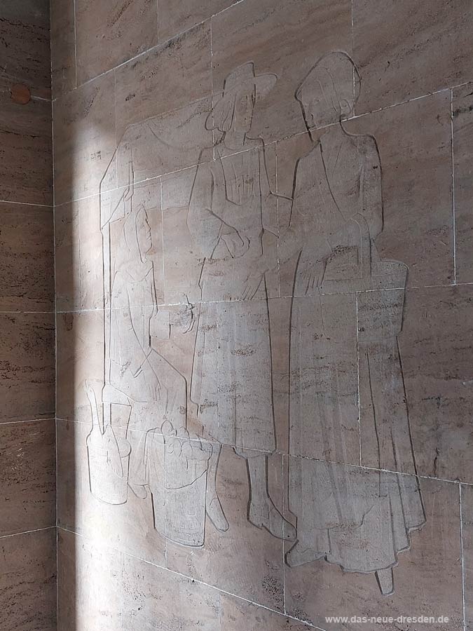 Relief Marktszene (Kunst am Bau) im Hintergrund, (beide Fotos: T.Kantschew 2023)