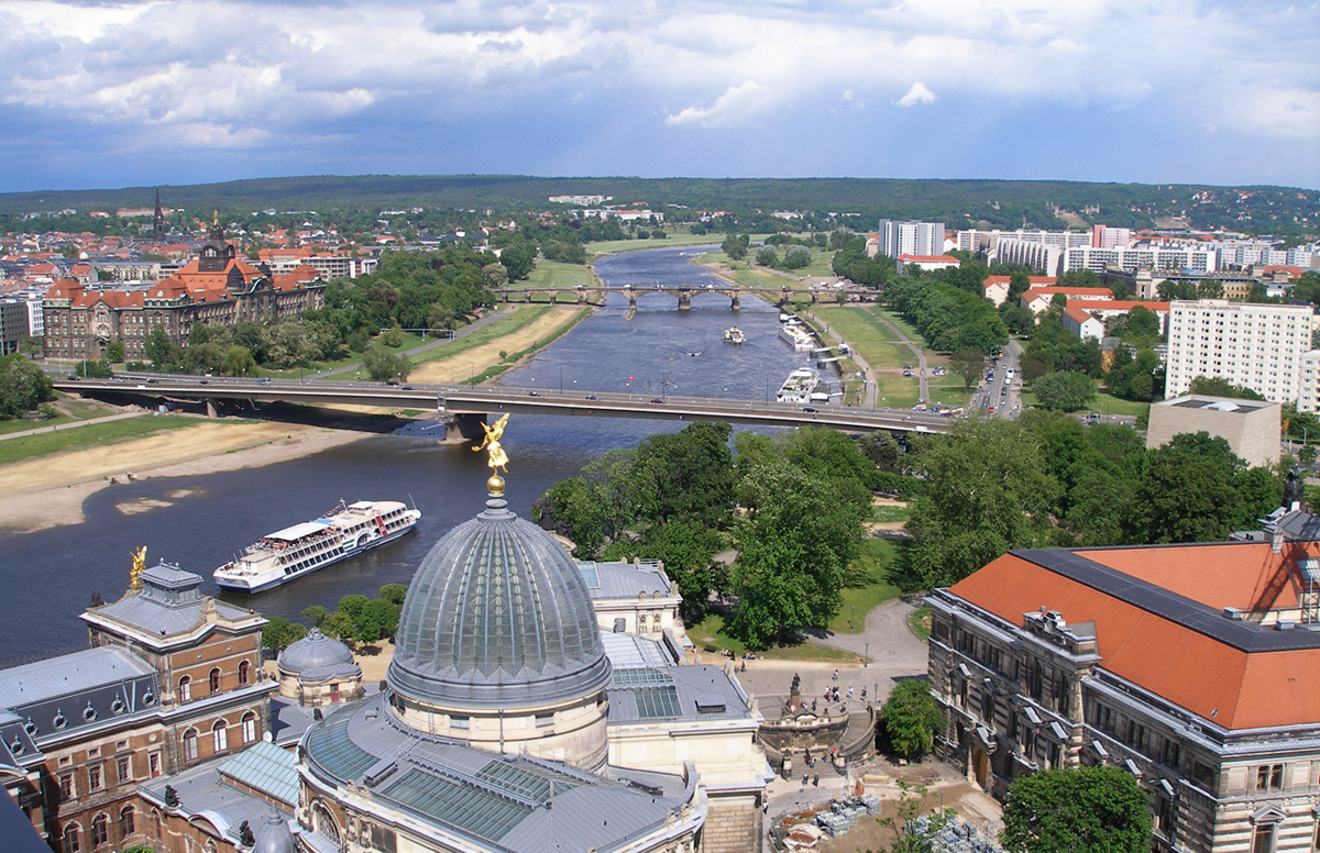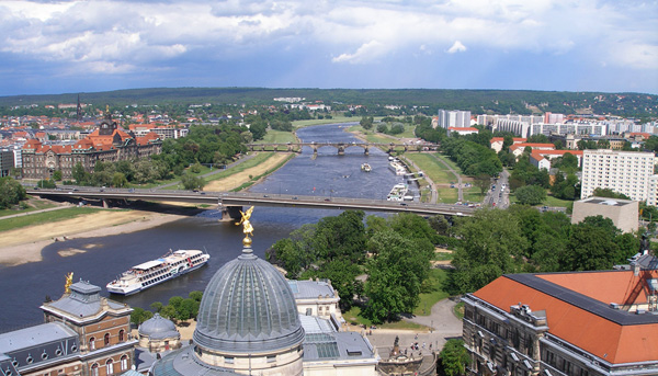![]() Panoramablick auf die Elbe und die Carolabrücke von der Kuppel der Frauenkirche 2007 (kurz vor dem Baubeginn der Waldschlösschenbrücke), Vergrößerung. Foto: Thomas Kantschew Text: Thomas Kantschew 2004 (mit späteren Ergänzungen, insbesondere 2024) |