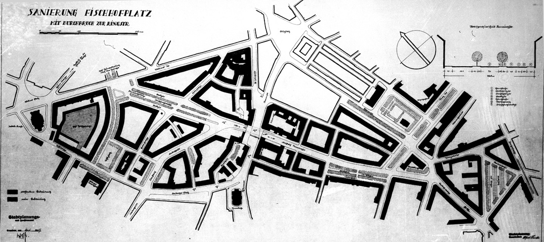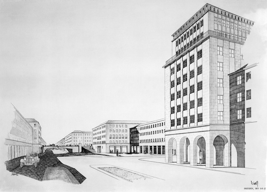 Gauforum, Altstadtsanierung und „Verkehrsgesundung“ Oberste und erste Priorität hatte bei diesem ersten Stadtumbauplan die Schaffung eines Gauforums und dessen Aufmarschstraße als Verbindung zum Dresdner Rathaus am Ring. Wilhelm Kreis hatte detaillierte Entwürfe zu diesem Parteiprojekt gefertigt. Die Anbindung vom Rathausplatz zum Hauptbahnhof war jedoch unbefriedigend. Eine neue direkte Straßenverbindung zwischen Rathausplatz und Wiener Platz sollte durch die vorhandene Christianstraße entstehen, die durch Hausabbrüche am Georgplatz und an der Prager Straße eine durchgehende Achse hätte bilden können, allerdings in dieser Phase unter Beibehaltung der ursprünglichen Breite. Zweite Intention dieses ersten Neugestaltungsplanes war die seit Jahrzehnten aufgeschobene „Altstadtsanierung“ in diesem Gebiet der Wilsdruffer Vorstadt (u.a. Fischhofplatz). Planungen existierten bereits seit der Jahrhundertwende 1900. ![]() Gesamtbebauungsplan Abth. 5 Wilsdruffer Vorstadt südlich der Wettiner Straße (mit Übersichtsplan, 1900- Ausschnitt), Nachtrag zum Ortsgesetze zum Gesamtbebauungsplane, vom 13.Dezember 1900 (Oberbürgermeister Beutler), Stadtplanungsamt Bildstelle / Stadtarchiv Dresden, 2.3.15 Baupolizeiamt, Nr. 1418, Akte: Bebauungsplan Wilsdruffer Vorstadt. Vergrößerung In diesem Plan von 1900 kann man gut erkennen, wie die Umgestaltung der Wilsdruffer Vorstadt mit einer Durchbruchstraße am Fischhofplatz und der Verbreiterung der Mittelstraße (schwarz markiert) als festzusetzende neue Fluchtlinien fest eingeplant worden war. Dennoch unterblieb eine Umsetzung all die Jahrzehnte. Die Sanierung dieser Gebiete des Kleinbürgertums und unterer Mittelschichten wurde sowohl in der Zeit bis Kriegsbeginn 1914 zurückgestellt, als auch in der sozialdemokratisch geprägten Zeit (21) nach der Revolution 1918/19 nicht in Angriff genommen. ![]() Geplanter Durchbruch Dresden Altstadt (rot gekennzeichnet im Original), nicht realisiert. Stadtplanungs- und Hochbauamt, Bildstelle. Stadtarchiv Dresden, 6.4.40.1 Stadtplanungsamt Bildstelle, Nr. XIII4960, Fotograf/in unbekannt, 1929, Vergrößerung Paul Wolf, Dresdner Stadtbaurat für Hochbauwesen und Stadterneuerung seit 1922, startete dann 1929 im Vorfeld der II. Hygiene-Ausstellung in Dresden 1930/31 einen neuen Versuch, das Problem anzugehen: ![]() Foto 1931, damaliges Stadtmodell (22) Originalunterschrift: „Geplanter Sanierungsdurchbruch in Dresden-Altstadt“ Im Modellfoto zu sehen: Annenkirche im Vordergrund, links oben Westkraftwerk am Wettiner Platz und in der Mitte der neue Durchbruch mit einem neuen langgestreckten Platz. Vergrößerung Pläne zur „Altstadt-Gesundung“, so die damalige Bezeichnung, beinhalteten 1931 den Abriss der nicht als wertvoll erachteten Vorstadtbebauung entlang einer das Stadtviertel schneidenden Durchbruchstraße. Aber auch dieser Versuch scheiterte. Wolf konnte in den letzten Jahren der Weimarer Republik keinen wirklichen Fortschritt in den Verbesserungen der Wohnbedingungen in den Altstädter Arbeiterquartieren, so u.a. eben in der Wilsdruffer Vorstadt erreichen. In seinem Artikel „Die gesunde Stadt“ heißt es: Immer dringlicher erscheint bei uns in Deutschland die Notwendigkeit der Beseitigung verwahrloster Wohnviertel. Dieses bedeutsame Problem bewegt heute alle Kulturländer der Erde, und auf dem internationalen Wohnungs- und Städtebaukongreß Berlin 1931 stand dieser Gegenstand besonders zur Erörterung. Leider sind fast überall die gesetzlichen Grundlagen für die zwangsmäßige Beseitigung verwahrloster Wohnhäuser und Wohnviertel noch ungenügend entwickelt, besonders hinsichtlich der Enteignungs- und Entschädigungsbestimmungen. (23) Nach der „Machtergreifung“ 1933 schienen sich für den Dresdner Stadtbaurat Wolf unter den radikal veränderten politischen Verhältnissen neue Optionen zu öffnen. Während einer „Tagung für Heimatschutz und Denkmalpflege und zur Gaukulturwoche.“ 1936 in Dresden hielt der Denkmalschützer Dr. Hans Joachim Glatzer in der typischen biologistischen Sprache der damaligen Zeit in Bezug auf die Probleme der Altstadtsanierung fest: Der Ruf nach dem Städtebau-Chirurgen (…) So erbten wir das Altstadtproblem, Problem zugleich in verkehrstechnischer, hygienischer und sozialer Beziehung. (…) Denn das steht unter den Eingeweihten fest: ohne das Messer des Chirurgen wird es in den meisten Altstädten — und auf lange Sicht auch in Dresden — nicht gehen, soll der Patient nicht an Luftmangel ersticken. (24) ![]() Fischhofplatz 15 vom 14.06.1934. Alles zum Abriss vorgesehen! Stadtarchiv Dresden, 6.4.40.1 Stadtplanungsamt Bildstelle, Nr. I1426, Fotograf/in unbekannt, 1934 Zur Klärung: Altstadtsanierung meinte in den 1930er Jahren in vielen Fällen „Kahlschlagsanierung“, im Sinne von alles abreißen und neu bauen. Auch in diesem Gebiet um den Fischhofplatz sollte das ganze herunter gekommene Viertel am Weißeritzmühlgraben der ehemaligen Fischergemeinde komplett abgerissen werden. Tatsächlich handelte es sich um einen der ältesten mittelalterlichen Siedlungskerne (ehemaliger Rundling) außerhalb der Festung Dresdens aus dem 15. Jahrhundert und damit um einen signifikanten Teil der späteren Residenz Dresden. (25) Das wachsende stadthistorische Interesse an diesen Teilen von „Alt-Dresden“, publiziert in Artikeln (26), Postkarten oder Zeichnungen stand kontrastreich neben einer angestrebten rabiaten Überformung dieses historischen Stadtviertels durch einen starken Modernisierungsschub. Diese Kahlschlagpraxis wurde in deutschen Städten erst viele Jahrzehnte später mit wirklicher Sanierung des Bestandes in bessere Bahnen gelenkt (in der Bundesrepublik ca. ab 1975, in der DDR später). Zeichnung in Kohle und Graphit von Curt Winkler, Ansicht aus Alt-Dresden Der Dresdner Künstler Curt Winkler war einer der wenigen, die sich für die alten Stadtviertel in der sich rasch wandelnden City interessierten und sie in Zeichnungen festhielten, so u.a. in di