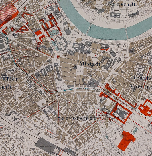 Fünfte Stufe: Mai 1940 Das Dresdner Stadtplanungsamt unter Paul Wolf fertigte im Mai 1940 einen weiteren fünften Plan zur Neugestaltung der Innenstadt Dresden an: ![]() Plan: „Neugestaltung der Innenstadt Dresden“, 23.05.1940 vom Stadtplanungs- und Hochbauamt Dresden. Nicht von Paul Wolf unterzeichnet, aber, da der Plan von seiner Behörde kam, wohl von ihm initiiert. Vergrößerung Foto: Stadtarchiv Dresden, 6.4.40.1 Stadtplanungsamt Bildstelle, Nr. II7864, Fotograf/in unbekannt, 1939. (schwarz: geplante Neubauten, schräge Schraffur: vorhandene Gebäude) Ein Grund könnte der neue Oberbürgermeister der Stadt Dresden, Dr. Hans Nieland, gewesen sein. Der Hamburger Senator und NSDAP-Mitglied Nieland war nach drei Jahren interimistischer Besetzung mit Rudolf Kluge am 08. Januar 1940 zum neuen Dresdner Oberbürgermeister ernannt und von Martin Mutschmann am 5.März 1940 in sein neues Amt eingewiesen worden. Er war Oberbürgermeister bis 19.Februar 1945. Nähere Infos zu Nieland: https://saebi.isgv.de/biografie/Hans_Nieland_(1900-1976) Tatsächlich wurde dieser Plan „Neugestaltung Innenstadt“ Dresden vom Mai 1940 nirgends publiziert. Möglicherweise war er im ersten Kriegsjahr nur für den internen Gebrauch innerhalb des Dresdner Stadtplanungsamtes bestimmt. Änderungen Die große breite Ausfallstraße nach Südosten wurde eine Nummer kleiner. Der große Platz am Ende der Achse entfiel. Es gab keine konkretere Planung von Großbauten entlang dieser Achse, die nun einen anderen, mehr nach Süden verlagerten Verlauf nehmen sollte. In dieser Konzeption von 1940 wurde eine erneute Durchbruchstraße durch die Wilsdruffer Vorstadt an der Annenkirche geplant – wieder mit Tunnelunterführung an dieser neuen Kreuzung. Am Freiberger Platz vorbeiführend, dort an der durchgezogenen Freiberger Straße einen neuen Platz bildend, war die Trasse nun nach Westen bis zum äußeren Ring (heute 26er Ring) gelegt. Besonders auffällig ist das erneut fett markierte, also wieder priorisierte Quartier in quadratischer Form anstelle der Mittelstraße am Westkraftwerk mit Anbindung an das neue Museumsquartier. Die „Altstadtsanierung“, also Überformung mit neuen Räumen, schien Paul Wolf bis zum Schluss immer wieder zu beschäftigen. Es ist sehr verwunderlich, dass das Stadtplanungsamt über den Kopf des allmächtigen Mutschmann und seiner 1939 festgelegten vier Schwerpunkte erneut eigene Schwerpunkte setzte. Vom Wiener Platz sollte nun 1940 die Durchbruchstraße ohne gebogenen Schwung Richtung Postplatz verlaufen, sondern in gerader Linie. Die Markthalle, das Gebäude der Deutschen Bank (Johannes-Ring 10) und weitere Gebäude am Altstädter Ring sollten jetzt doch erhalten werden. Offenbar hatte es Kritik über die massiven Abrisspläne gegeben, war doch gerade die Markthalle für die Einwohner der Viertel ringsum unentbehrlich im täglichen Leben. Zudem wurde jetzt hier an dieser neuen Kreuzung ein Parkplatz eingeplant. ![]() Foto um 1935: Sammlung „altesdresden.de“. Sollte nun doch erhalten werden: Gebäude Antonplatz 1 am Ring. Das geplante Museumsviertel hinter der Semperoper wurde noch einmal vergrößert. Fast alle Speicheranlagen sollten nun, durch die komplette Aufgabe des ehemaligen innerstädtischen Hafengeländes, abgerissen werden. Der Dresdner Architekt und Künstler Paul Andrae entwickelte, von der staatlichen Hochbaudirektion beauftragt, neohistoristische Pläne für ein neues ausgedehntes Museumsquartier. Dieses hätte eine zentrale symmetrische Mittelachse durchzogen, die vom Theaterplatz bis zu einem monumentalen Gebäude am Ende der Achse gereicht hätte. Zur Elbe hin war dann eine Promenade als neue Terrasse geplant, die an die historische Altstadtsilhouette anschließen sollte und mit der die NS-Landesverwaltung im „Fremdenverkehr“ nach dem gewonnenen Krieg imponieren wollte. Die Pläne der sächs. Hochbaudirektion und vom Dresdner Stadtplanungsamt, neun Monate nach Kriegsbeginn mit den Überfällen auf Polen, Belgien, Niederlande, Luxemburg, Dänemark und am Beginn des Frankreichfeldzuges signalisieren: selbst im Weltkrieg hatte es offenbar noch eine Priorität, die Neugestaltung der Dresdner Innenstadt weiter zu modifizieren – für die Zeit nach dem „Endsieg“, von dem man sich nicht vorstellen möchte, wie Deutschland, Europa und die Welt dann ausgesehen hätten. In einer modifizierten Planung, die sich bis ins Jahr 1942 erstreckte, sollte die von Wilhelm Kreis bereits in der Ausführung begriffene Opernhaus-Erweiterung mit einem neuen Gebäudeflügel verdeckt und abgeriegelt werden zugunsten eines ausgedehnten Forumplatzes in einheitlicher Architektursprache mit Kolonaden, einem hohen Campanile, einem Torgebäude und einer durch Stufen abgesenkten, quadratischen Platzfläche. Auch dieser geplante „weihevolle“ Stadtplatz sollte einer propagandistischen Manipulation seitens der Machthaber dienen. Das fertiggestellte Modell wurde Ende 1942 fotografiert, als in der Schlacht um Stalingrad die deutsche Wehrmacht eine verheerende Niederlage erlitt und damit der Weltkrieg endlich eine andere Wendung nahm. ![]() Modell Neugestaltung der „Speicherterrassen“, Aufnahmedatum 08.11.1942, spätere Fassung mit Obelisk am Ende der Achse, Foto (Ausschnitt): Stadtplanungs- und Hochbauamt Dresden, Bildstelle. Vergrößerung Stadtarchiv Dresden, 6.4.40.1 Stadtplanungsamt Bildstelle, Nr. XIII3881, Fotograf/in unbekannt, 1942 Planung zur „Dresden Erschließung“ von Oberregierungsrat Heinrich Koch 1940 Das Stadtplanungs- und Hochbauamt Dresden unter Paul Wolf war im Jahr 1940 jedoch nicht die einzige Stelle, die sich um die Zukunft der Verkehrsführung in der Innenstadt von Dresden Gedanken machte. Der Dresdner Architekt und Oberregierungsbaurat Heinrich Koch (1873-1945), bekannt durch die Ausführung des Sächsischen Hauptstaatsarchives 1912 bis 1915 auf Neustädter Seite, fertigte im zweiten Kriegsjahr 1940 umfangreiche Pläne zur „Dresden Erschließung“ mit altem un