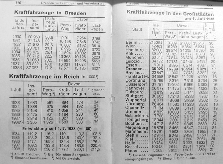 77) Gesetzestext: „Gesetz über die einstweilige Neuregelung des Straßenwesens und der Straßenverwaltung vom 26. März 1934", (RGBl. I, 1934 243-245), Siehe: www.autobahngeschichte.com (PDF) 78) Zum Vergleich: in Paris wurden 1937 Straßenbahnen komplett abgeschafft und durch Busse ersetzt. Die letzte Tram fuhr am 15. März 1937, siehe: https://de.wikipedia.org (Geschichte der Straßenbahn in der Île-de-France). Die Weltausstellung Paris 1937 (Exposition Internationale des Arts et Techniques dans la Vie Moderne) begann am 25.Mai 1937. 79) Adressbuch für Dresden und Vororte 1938, S.6 80) Genaue Aufschlüsselung der Zahlen von 1930 bis 1938 in "Die Großstadt Dresden 1939. Statistisches Taschenbuch und Kalender", Hrsg v. Statistischen Amt der Landeshauptstadt Dresden 1939. S.110-111. 81) Christian Suhr: Kraftverkehrsgesellschaft Sachsen 1919-1945 | Wurzeln - Werdegang - Fahrzeuge, 1998, Kapitel: „Hochkonjunktur unterm Hakenkreuz“, S. 70-77. 82) DNN am 25.04.1938. Paul Wolf griff hier auf einen bereits 1925 gehaltenen Vortrag zurück: „Der Einfluß des Verkehrs auf die Stadtform“, in: Städtebau-Vorträge. Der zweiten Dresdener Städtebauwoche 1925, Genzmer, Ewald u. Paul Wolf (Hg.), Verlag: Berlin, Der Zirkel, 1926 |