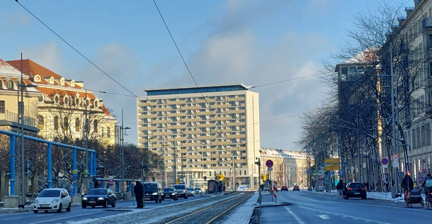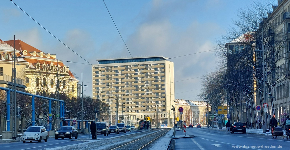 Das Appartementhochhaus mit Flachtrakt (ehem. Restaurantkomplex) bildet den östlichen städtebaulichen Abschluß der Wilsdruffer Str., früher: Ernst-Thälmann-Straße, als der ehem. politisch prägenden Demonstrationsachse quer durch die Altstadt. Es war als point de vue bei den nach Osten marschierenden "Werktätigen" Zielpunkt der 1. Mai-Demonstrationen in der DDR. Auf dem Dach stand für zwei Jahrzehnte der Spruch: "Der Sozialismus siegt". Bereits in der Bauzeit wurde das markante, den Pirnaischen Platz dominierende Hochhaus politisch aufgeladen. Zahlreiche Fotografien aus den späten 1960er Jahren zeigen, wie dieses Gebäude propagandistisch eine exponierte Stellung erhalten sollte. Im starken Kontrast stand der Widerwille und die Ablehnung in breiten Kreisen der Dresdner Bevölkerung, die sowohl politisch als auch ästhetisch gegen diesen Bau, der an offiziellen DDR-Feiertagen immer vorbildlich in jeder Wohnung beflaggt werden musste, rebellierte. Rein sachlich gesehen bietet der 14-geschossige Baukörper 120 Eineinhalb- und 60 Einraumwohnungen mit idealer Besonnung von West- bzw. Ostseite. Von den oberen Stockwerken hat man eine grandiose Sicht auf die Altstadt oder auf die Elbtalhänge bis zur Sächsischen Schweiz. Die Stahlbetonskelett-Bauweise ragte mit ihrer Loggienfassade und verschiedenen architektonischen Besonderheiten aus der genormten Fertigteilproduktion des DDR-Plattenbaus als Sonderbau heraus. Der Bau ist aus einem Elementsortiment einer 8-geschossigen Wohnungsbauserie entwickelt worden. Städtebaulicher Kreuzungspunkt Das 48 m hohe Gebäude ist nicht nur ein markanter Abschluss der Ost-West-Magistrale, sondern ebenso städte-baulich heraus gehobener Teil des Nord-Süd-Verkehrszuges, welcher die großzügige Moderne der autogerechten Stadt unter Beweis stellen sollte. Peter Sniegon bezog sich in seiner Konzeption auf die rhythmischen Folge von kubischen Baublöcken von der Carolabrücke bis zum Pirnaischen Platz. Diese Modernität unterstrich auch die großflächige Reklame an der südlichen Stirnseite, die für ein frühes Computer-System warb. Allerdings war das Hochhaus erst nachträglich als städte- bauliche vertikale Dominante zur Ost-West-Magistrale hinzu- gekommen. Farbfoto ca. 1967. Noch Ende der 1950er Jahre sollte ein Hochhaus direkt am Altmarkt dominieren. Über die künftige Höhe des Hochhauses wurde im Planungsprozess kontrovers diskutiert. Sniegon schrieb 1968: „ob eine größere Höhe städtebaulich günstiger gewirkt hätte – die Vorbereitung ließ keine Veränderung der Objekte mehr zu“. 14 Geschosse waren nach Ansicht von Sniegon ideal, damit der „Raum Thälmannstraße, wenn man vom Postplatz kommt, gerade in der Höhe der endenden Traufkante der Bebauung Thälmannstraße abgeschlossen und dadurch eine günstige Ruhe im optischen Abschluss erzielt werden wird.“ (DA 04/1968) Kurt Leucht als „Stadtarchitekt“ von Dresden und Peter Sniegon als Stellvertretender Stadtarchitekt wollten die Dresdner Altstadt von Hochhäusern verschonen, dafür aber eine "Betonung des Stadtzentrums durch Höhendominanten am inneren Tangentenring" erreichen. Zum Stadtzentrum war auch die ehemalige Pirnaische Vorstadt seit 1962 hinzu gezählt worden. Durch Tunnel und Straßenkreuzung von der Altstadt getrennt Negativ wirkte sich gerade jene verkehrstechnische Lage an der Nord-Süd-Trasse aus. Die Erreichbarkeit des Gebäudes war durch einen langen Fußgängertunnel (zugeschüttet 2010) nur sehr schwer gegeben. Ebenerdig war das Hochhaus lediglich von Nordosten zu erreichen. Parkplätze waren für Restaurant-Besucher nicht vorhanden. Restaurants im Flachtrakt Jenseits der Verkehrstrasse "Leningrader Straße" war der Restaurantkomplex im vorgelagerten Flachtrakt eine kleine urbane Oase städtischen Lebens (insgesamt 408 Sitzplätze). Neben dem HO-Restaurant "Pirnaisches Tor" gab es eine Kaffeeterrasse auf dem Dach, eine Mokkabar und besonders beliebt eine Fischgrillbar, vor der sich stets lange Warte-schlangen bildeten. Dazu kam eine "Selbstbedienungs-kaufhalle" mit 180 m². Architektonische Besonderheiten An dem Hochhaus fallen etliche architektonische Besonder-heiten auf: das Flügeldach, das als Sonnendachgeschoss von allen Bewohnern gemeinschaftlich genutzt wurde, die Beton-V-Stützen im Erdgeschoss, durchgehende Loggien, die keramischen Formsteine als Abschirmung zur Hauptstraße (von Dieter Graupner 1966/1967) und bis zu seiner Überformung die Leichtigkeit und Eleganz des Flachtraktes mit den Pergola-Elementen. Im Vergleich: das Hotel Newa an der Prager Straße, ein ähnlich gelagertes rechteckig-kubisches Hochhaus mit kontrastierenden, vorgelagerten Flachtrakt wird im Gegensatz nicht so stark abgelehnt, wirkt aber als städtebaulicher Abschluss der Prager Straße ähnlich raumbildend. Die Architektur des Hochhauses am Pirnaischen Platz ist aber deshalb so verhasst, weil sie mit politischer Willkür und Diktatur in Verbindung gebracht wird. Matz Griebel verspottete z.B. 1979 in einem legendären Foto (von Ernst Hirsch) die Arroganz der Machthaber, in der er sich vor diesem Hochhaus mit Frack und Hochrad ablichten ließ. Der postulierte gesellschaftliche Fortschritt geriet immer mehr zur Farce. 1) Tatsächlich war den SED-Herrschern der provokative Spruch auf dem Dach 1987 so peinlich geworden, dass die rote Leuchtschrift über Nacht (angeblich auf Veranlassung von Bürgermeister Wolfgang Berghofer) demontiert wurde. Auch nach 1989 wurde das Haus von der Dresdner Bürgerschaft mit Ignoranz und Ablehnung bedacht, zusehens verfiel das Gebäude, während mittlerweile die meisten Gebäude der DDR saniert wurden. Auch der ehemalige Besitzer der Immobilie Segal Group investierte nur das Allernötigste, weil die geplante Sanierung an diversen Streitpunkten scheiterte. 2020 wurde das Gebäude verkauft, der neue Investor konnte 2025 die Sanierung abschließen. Erhaltungszustand bis 2022 Bis 2022 gab es kaum richtige Sanierungsmaßnahmen an dem Gebäude. Verunglimpf