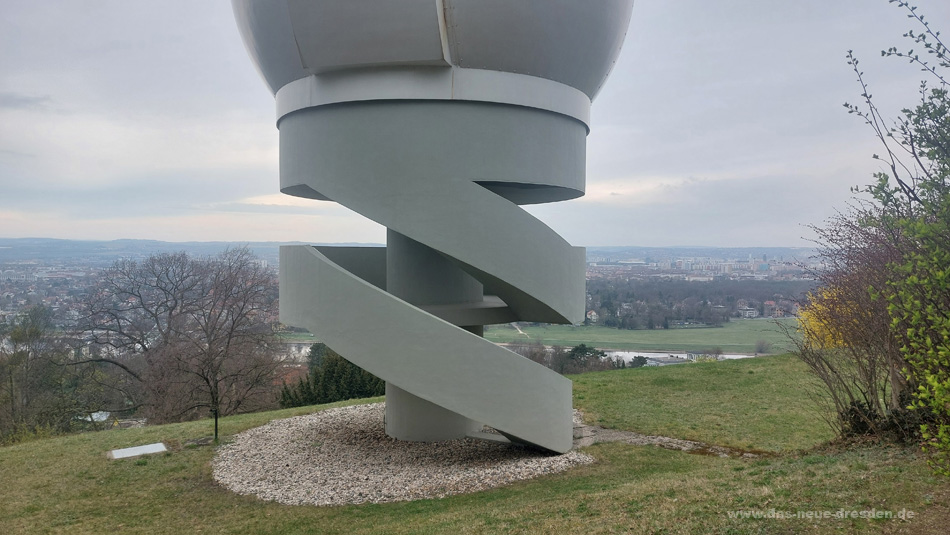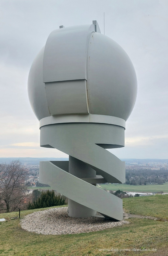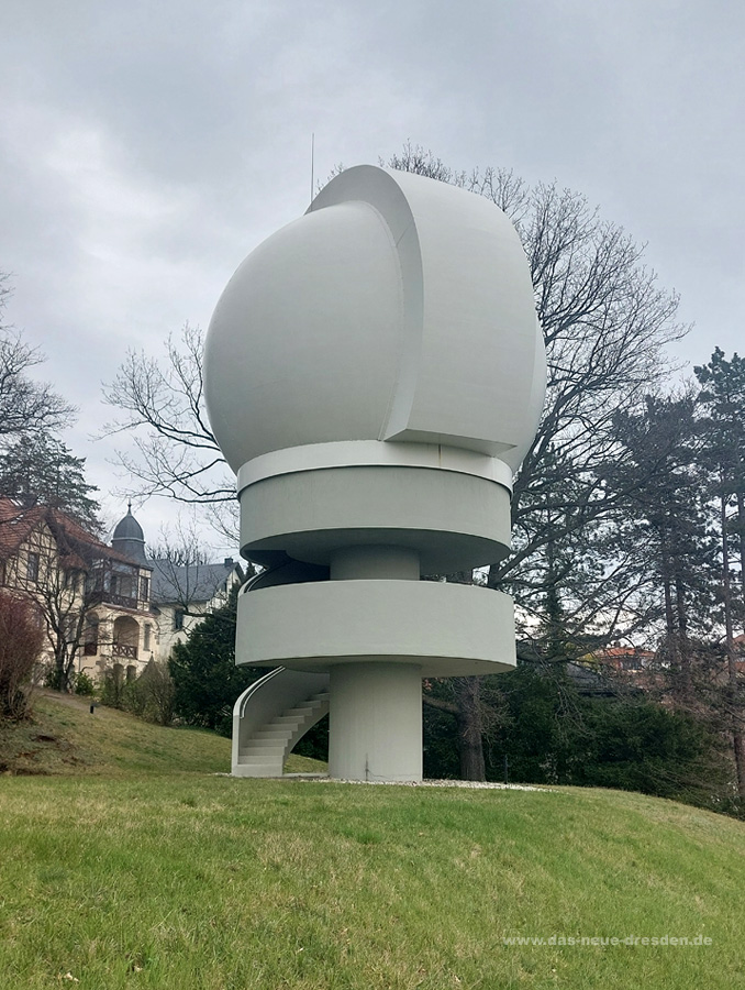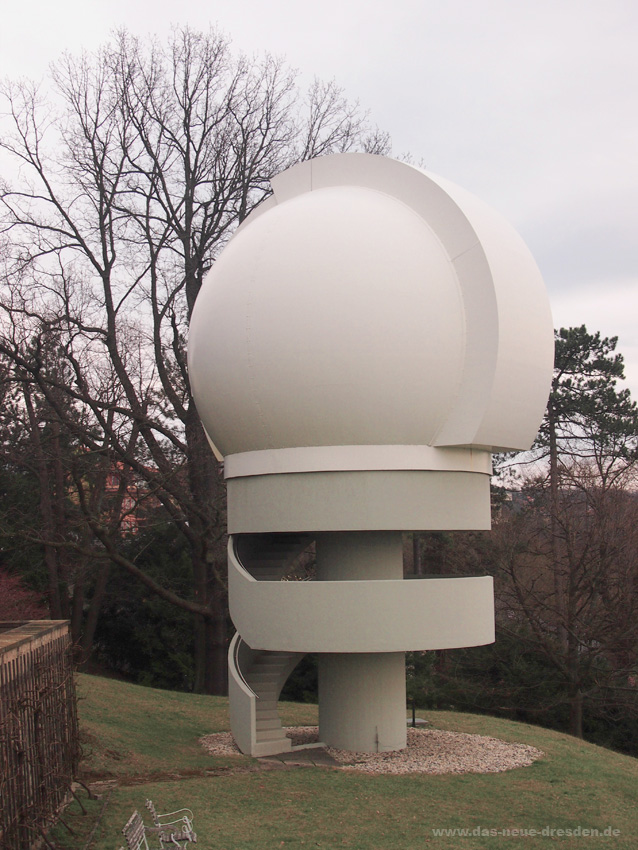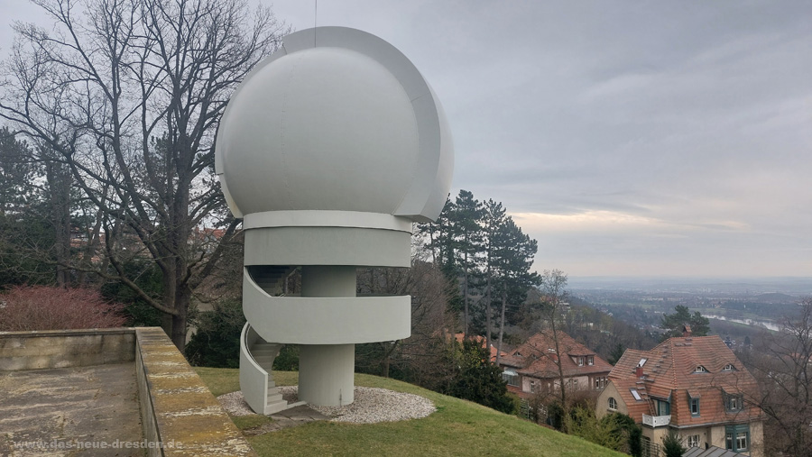 Architektur - Konstruktion 1969 im Jahr der Mondlandung wächst in den geteilten politischen Sphären von Ost und West eine starke Weltraumbegeisterung. Das sogenannte Space Age hinterlässt seine Spuren auch in Dresden. Nur wenige Kilometer entfernt vom Ardenne Institut entsteht der Dresdner Fernsehturm in Sichtweite, an dem ebenfalls der Ingenieur Prof. Hermann Rühle als Statiker beteiligt ist. Bei der privaten Sternwarte entscheidet sich Rühle, um eine möglichst schwingungsfreie Standfläche des empfindlichen Teleskopes zu gewährleisten, dass die Stahlbetonsäule, auf der das Teleskop steht, separat errichtet wird. Die Kugel darüber mit ihrem Boden ist somit mechanisch entkoppelt von der baulichen Umgebungskonstruktion. So übertragen sich Schritte von Personen im Raum nicht auf das Instrument, sondern werden kegelförmig über die Außenkonstruktion abgeleitet. Durch den schlanken hohen Sockelschaft wird die Kugel deutlich günstiger vertikal positioniert, um das Teleskop über die Baumwipfel auszurichten. Für die Betrachter unten im Elbtal stellt sich der Eindruck ein, die Kugel "schwebe" sozusagen auf dem Betonsockel, was aber eben ganz praktische Gründe hat. Zur Kuppel gelangt man über die elegante Außentreppe, die das Funktionale mit dem spektakulären Ausblick verbindet. Zum Norden zu dreht sich die Treppe als Halbspirale um den Schaft und nach Süden zum Elbtal bietet sie eine vertikale ruhige Aussichtsetage. Durch eine Bodenklappe gelangt man in den Kuppelraum. Das Kugelmaterial selbst besteht aus Kunststoff, versetzt mit Epoxidharz (3). Der Rest der Konstruktion, der Spaltöffnung mitsamt Zahngetriebe und weiterer Einzelteile ist aus Stahl. Die im Durchmesser sieben Meter breite Kuppel kann 360° gedreht werden, damit das Teleskop in alle Himmelsrichtungen positioniert werden kann. Die verschließbare Spaltöffnung öffnet sich mittels einer Zahnradvorrichtung, die noch im Original funktioniert. Die relativ schmale Öffnung, manchmal auch als Visier bezeichnet, hat u.a. die Aufgabe die Einflüsse von Wind, Staub und Lichtsmog auf den Innenraum der Sternwarte zu minimieren. |