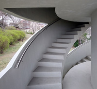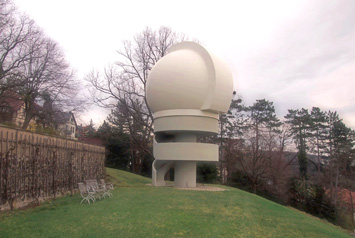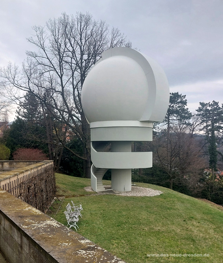 ![]() Sternwarte mit der halbseitig spiralförmigen Treppe an der Nordseite. In der Mitte der Kugel die Spaltöffnung für das Teleskop. Foto: TK März 2026, Vergrößerung |