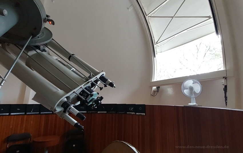 ![]() Das 25cm-Teleskop. Gut zu erkennen die Fuge am Boden des auf dem separaten Pfeiler-Fundament stehenden Gerätes. Foto: TK 2026, Vergrößerung |