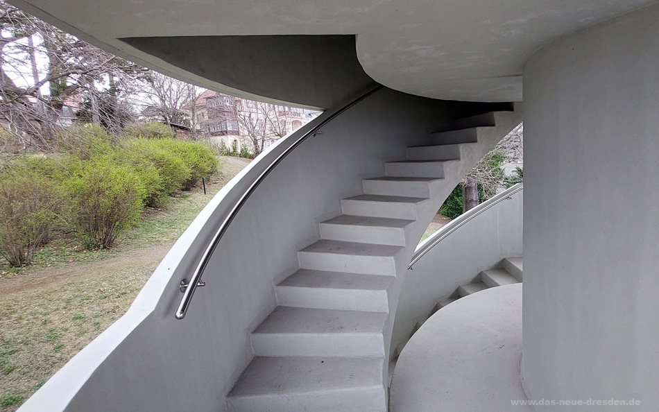 ![]() Die Betontreppe der Sternwarte, halb Aussichtsgeschoss, halb Spiraltreppe um den Schaft. Foto: TK März 2026, Vergrößerung ![]() Das Aussichtsgeschoss der Sternwarte mit dem weiten Panoramablick ins Elbtal. Foto: TK 2026, Vergrößerung |