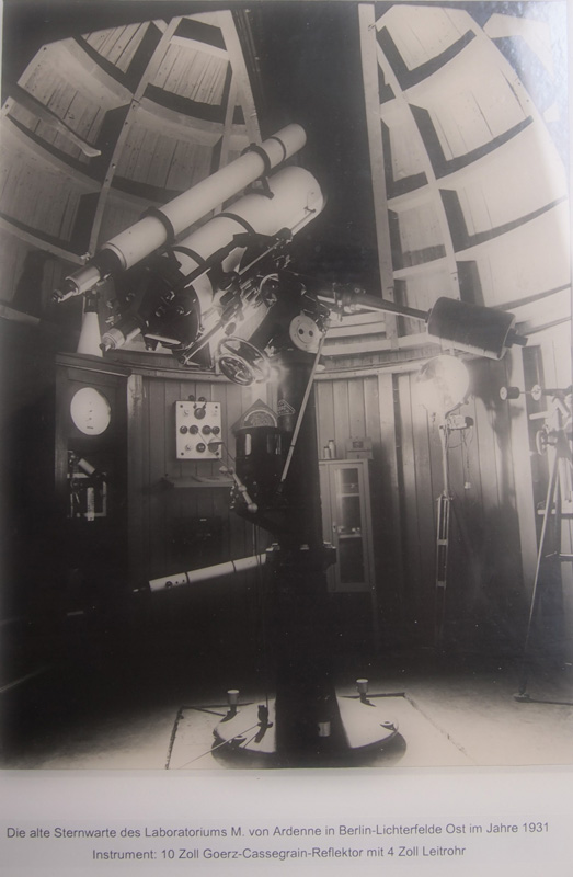 Entstehung der Sternwarte 1968 -69 1960 zog die Familie Ardenne in die größere Villa Meissner, 1912 von Lossow & Kühne direkt am Elbhang errichtet. Der Wissenschaftler Ardenne wollte wieder eine Sternwarte ganz in der Nähe seines neuen Wohnhauses und beauftragte den Architekten Bauer und den Statiker Prof. Rühle mit der Konzeption. Als kompletter Solitärbau sollte das technische Bauwerk bessere Bedingungen erhalten, um den nächtlichen Sternenhimmel optimal studieren zu können. Ardenne war schon seit seiner Jugend begeistert von Astronomie und dem Betrachten des Universums. Bereits als junger Mann baute er in seinem Institut in Berlin Lichterfelde eine erste eigene Sternwarte. (Foto 1931 von der Ardenne-Sternwarte). Das Teleskop, wie alle technischen Geräte, wurden 1945 von den Sowjets mitsamt dem Wissenschaftler, seiner Familie und seiner Mitarbeiter in die UdSSR geschafft. 1955 kam das Gerät nach Deutschland zurück und ist als historisches Teleskop noch heute in der alten Ardenne-Sternwarte an der Plattleite zu bewundern. (2) Die ältere Sternwarte von 1956 war und ist für das breite Publikum und Schulbesuche geöffnet. Buchungen: https://sternwarte-dresden.de |