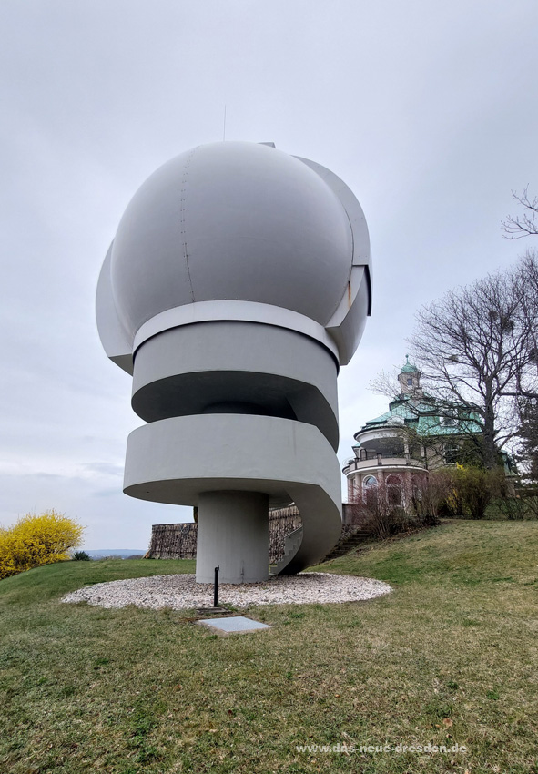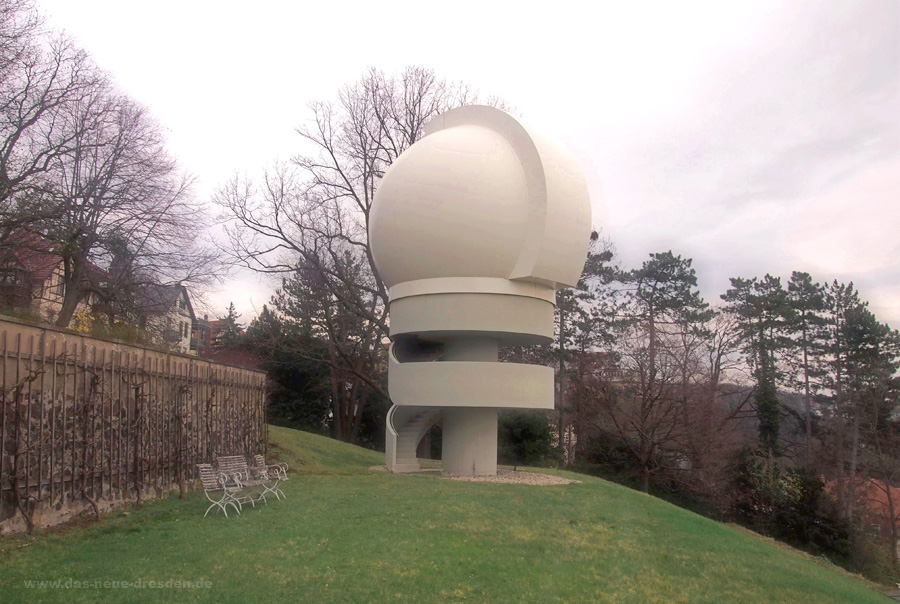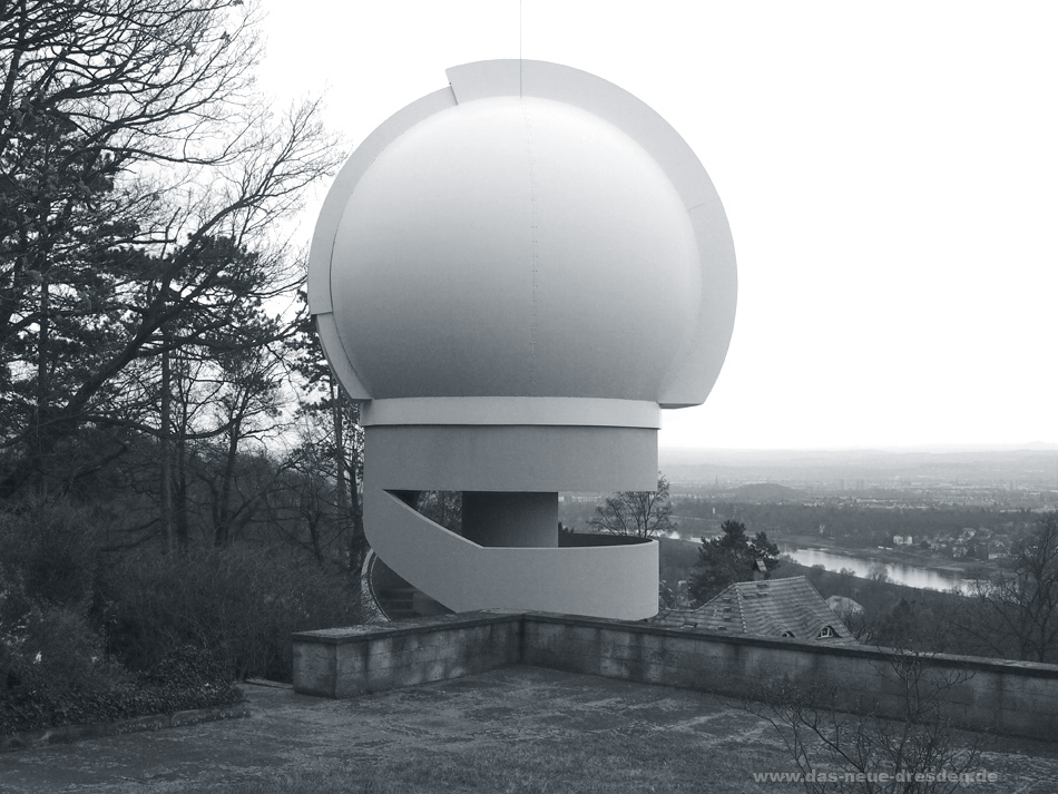 Architektur - Konstruktion 1969 im Jahr der Mondlandung wächst in den geteilten politischen Sphären von Ost und West eine starke Weltraumbegeisterung. Das sogenannte Space Age hinterlässt seine Spuren auch in Dresden. Nur wenige Kilometer entfernt vom Ardenne Institut entsteht der Dresdner Fernsehturm in Sichtweite, an dem ebenfalls der Ingenieur Prof. Hermann Rühle als Statiker beteiligt ist. Bei der privaten Sternwarte entscheidet sich Rühle, um eine möglichst schwingungsfreie Standfläche des empfindlichen Teleskopes zu gewährleisten, dass die Stahlbetonsäule, auf der das Teleskop steht, separat errichtet wird. Die Kugel darüber mit ihrem Boden ist somit mechanisch entkoppelt von der baulichen Umgebungskonstruktion. So übertragen sich Schritte von Personen im Raum nicht auf das Instrument, sondern werden kegelförmig über die Außenkonstruktion abgeleitet. Durch den schlanken hohen Sockelschaft wird die Kugel deutlich günstiger vertikal positioniert, um das Teleskop über die Baumwipfel auszurichten. Für die Betrachter unten im Elbtal stellt sich der Eindruck ein, die Kugel "schwebe" sozusagen auf dem Betonsockel, was aber eben ganz praktische Gründe hat. Zur Kuppel gelangt man über die elegante Außentreppe, die das Funktionale mit dem spektakulären Ausblick verbindet. Zum Norden zu dreht sich die Treppe als Halbspirale um den Schaft und nach Süden zum Elbtal bietet sie eine vertikale ruhige Aussichtsetage. Durch eine Bodenklappe gelangt man in den Kuppelraum. Das Kugelmaterial selbst besteht aus Kunststoff, versetzt mit Epoxidharz (3). Der Rest der Konstruktion, der Spaltöffnung mitsamt Zahngetriebe und weiterer Einzelteile ist aus Stahl. Die im Durchmesser sieben Meter breite Kuppel kann 360° gedreht werden, damit das Teleskop in alle Himmelsrichtungen positioniert werden kann. Die verschließbare Spaltöffnung öffnet sich mittels einer Zahnradvorrichtung, die noch im Original funktioniert. Die relativ schmale Öffnung, manchmal auch als Visier bezeichnet, hat u.a. die Aufgabe die Einflüsse von Wind, Staub und Lichtsmog auf den Innenraum der Sternwarte zu minimieren. |