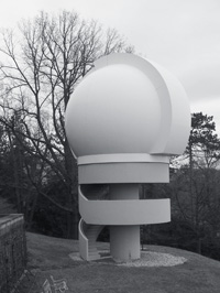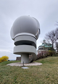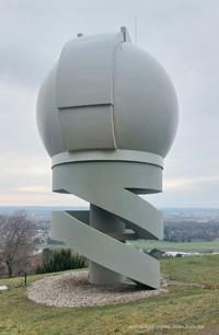 ![]() Sternwarte mit der halbseitig spiralförmigen Treppe an der Nordseite. In der Mitte der Kugel die Spaltöffnung für das Teleskop. Foto: TK März 2026, Vergrößerung |