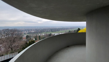 ![]() Die Betontreppe der Sternwarte, halb Aussichtsgeschoss, halb Spiraltreppe um den Schaft. Foto: TK März 2026, Vergrößerung ![]() Das Aussichtsgeschoss der Sternwarte mit dem weiten Panoramablick ins Elbtal. Foto: TK 2026, Vergrößerung |