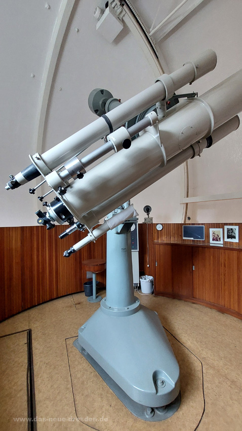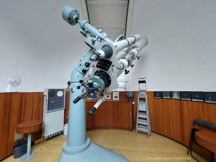 ![]() Das 25cm-Teleskop. Gut zu erkennen die Fuge am Boden des auf dem separaten Pfeiler-Fundament stehenden Gerätes. Foto: TK 2026, Vergrößerung |