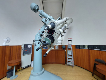 ![]() Sternwarte Innenraum der Kuppel mit dem 3,20 m langen Teleskop von der Firma Carl Zeiss Jena. Foto: TK 2026, In der Vergrößerung sind Teile des maßgefertigten Interieurs zu sehen, wie z.B. der gebogene Einbauschrank und die runden Tische. |