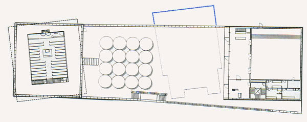 Grundriss neue Synagoge mit Leerstelle der 1938 zerstörten Synagoge. Leider ist 2001 der Grundriss der alten Synagoge nicht - wie hier im Plan vorgesehen - außerhalb des Grundstücks markiert worden. Gerade auf den Gehwegplatten der Straßenbahnhaltestelle wäre dieser Hinweis aber sehr nützlich. Es wäre für das politische Bewusstsein der Stadt wünschenswert, wenn die Stadt Dresden, gemeinsam mit der Dresdner Verkehrsbetriebe AG an dieser Stelle die unvollendet gebliebene Markierung nachträglich konsequent umsetzte.